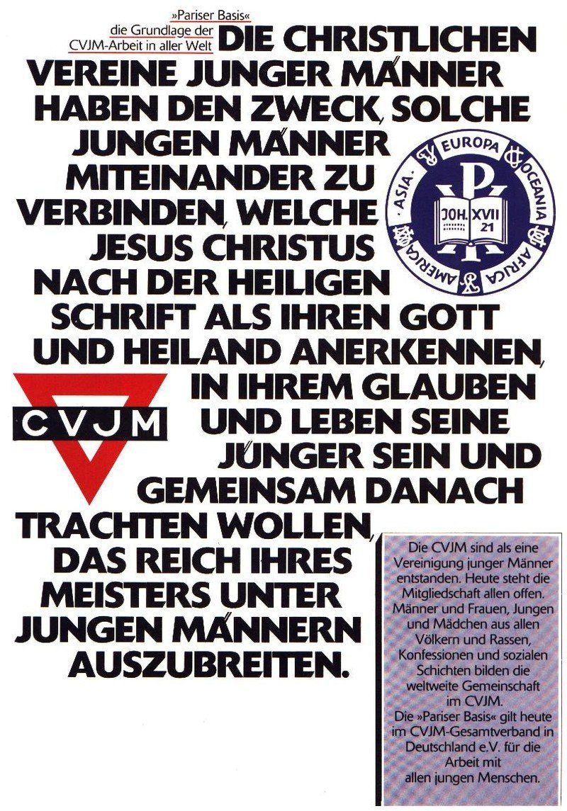 Wir leben und arbeiten auf der Grundlage der „Pariser Basis", die 1855 bei der Weltausstellung in Paris von jungen Männern formuliert wurde. Sie ist seit her Basis aller CVJM-Arbeit weltweit. In den alle 4 Jahre stattfindenden Weltratstagungen werden von dieser Basis her die Themen diskutiert, die für die jeweilige gesellschaftliche Situation wichtig sind. So wurde z.B. in Deutschland 1970 aus dem christlichen Verein junger Männer der christliche Verein junger Menschen.